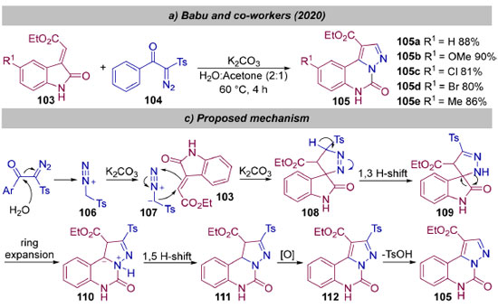 In the recent work published by Ramu and co-workers, a metal-free strategy was employed to synthesize pyrazolo[1,5-c]quinazolines 105 from 3-ylideneoxindoles 103 and tosyldiazomethane 104 (Scheme 21).54 In this case, an azomethine ylide was used as dipole.55,56 By employing potassium carbonate as a base, high yields and regioselectivities were observed. In this case, it was proposed that water initially reacts with diazo compound 104 giving intermediate 106 after elimination of the benzoate anion. Then, 106 undergoes a proton abstraction to form azomethine ylide species 107, which reacts with 3-ylideneoxindole 103 in a 1,3-DC, giving spiro-compound 108. Next, a 1,3 H-shift occurs, leading to 109, followed by a ring expansion step, furnishing 110. Subsequently, a 1,5 H-shift gives 111, which is oxidized the pyrazolo[1,5-c]quinazoline 112. Finally, the elimination of the tosyl group from 112 gives rise to product 105 (Scheme 21b).