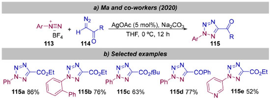 Another interesting example of 1,3-DC was reported in 2020 by Xiao and co-workers, who described the reaction between arenediazonium salts 113 and diazoacetates 114 under silver catalysis to furnish carboxylic tetrazoles 115 (Scheme 22). This straightforward approach was applicable to a wide range of diazoacetates functionalized with different groups, as well as to a variety of areniumdiazonium salts, leading to the corresponding products in moderate to excellent yields (Scheme 22b, 46-92%).57