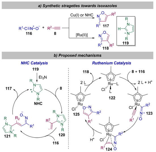 Synthesis of Isooxazoline/Isoxazolidine and Oxadiazole Derivatives Nitrile oxides are another interesting class of 1,3-dipoles for 1,3-DC, having the potential of generating important N,O-heterocyclic compounds when reacted with different dipolarophiles. Similarly to the reaction between azides and alkynes, the thermal 1,3-DC between nitrile oxides and alkynes may require catalysts in order achieve good levels of regioselectivity. As depicted in Scheme 23, the copper(I)- and N-heterocyclic carbene (NHC)-catalyzed 1,3-DC of nitrile oxide generates 3,5-disubstituted isoxazoles, while reactions catalyzed by ruthenium(II) result in the 3,4-disubstituted isoxazoles.58