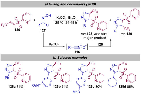 The proposed mechanism for the Cu- and Ru-promoted transformations are analogous to those of CuAAC. In the case of the Ru-catalyzed reaction, both reagents 116 and 8 initially coordinate with the metal, giving intermediate 123, which next undergoes the formation of ruthenacycle 124, and subsequently 125 after an oxidative coupling, followed by the release of 3,4-disubstituted isoxazole 118 in the final step (Scheme 23b). In the NHC-promoted process, the treatment of imidazolium salt 119 with triethylamine (Et3N) gives the NHC catalyst, which regioselectively adds to the alkyne, forming zwitterionic adduct 120 (Scheme 23b). Next, 120 adds to the nitrile oxide 116, giving zwitterionic species 121, which undergoes an oxygen hetero-cyclization step and releases 3,5-disubstituted isoxazole product 117 and the NHC catalyst. The use of nitrile oxides is comparatively underdeveloped as a consequence of their high propensity to dimerize to the related furoxan, and so their generation in situ has become an alternative to overcome this issue. A recent example of this type of process is the work published by Ou and co-workers in 2019, which described the 1,3-DC between β-fluoroalkyl-vinyl 2-pyridylsulfones 126 and nitrile oxides formed from hydroxamoyl chlorides 127 to deliver isoxazoline derivatives 128 (Scheme 24). This base-catalyzed approach allowed the rapid access to several isoxazoles derivatives in moderate to good yields (Scheme 24b, 48-85%).59
