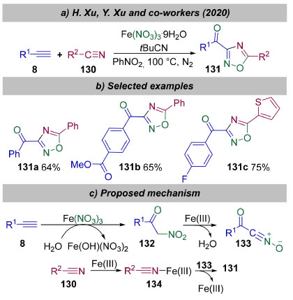 Other recent example that involves the generation of nitrile oxides in situ involves their formation in the presence of Fe(III) nitrate, as reported by H.Xu, Y.Xu and co-workers (Scheme 25).60 As showed in Scheme 25c, the alkyne 8 initially reacts with the iron salt, giving α-nitroketone 132, which is further dehydrated to nitrile oxide 133. Next, the cycloaddition between 133 and iron-bonded nitrile 134 gives the 3-acyl-1,2,4-oxadiazole products 131.