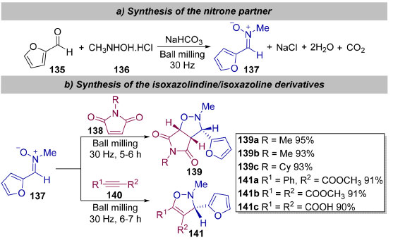 In addition to nitrile oxides, nitrones may also be used as dipoles in 1,3-DC reactions to synthesize heterocyclic compounds. However, most reported procedures for the synthesis of isoxazolidine and isoxazoline derivatives often require drastic experimental conditions such as high temperature and long reaction times. Considering these facts, Chakraborty recently reported an efficient mechanochemical method for the synthesis of N-methyl-C-(2-furyl) nitrone 137 from furfural 135 and N-methylhydroxylamine 136 (Scheme 26a), as well as its 1,3-DC reaction with activated alkenes and electron deficient alkynes (Scheme 26b). In this sense, the 1,3-DC between 137 and substituted maleimides 138 led to the bicyclic isoxazolidines 139, while the reaction of 137 with internal alkynes 140 gave isoxazolines 141 (Scheme 26b). Importantly, the use of ball milling significantly increased the reaction rate and improved the yields.61