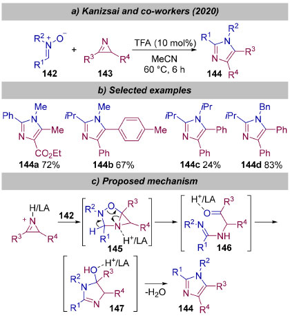 Synthesis of imidazole, imidazoline and thiazole derivatives Another very interesting recent application of 1,3-DC reaction was reported recently by Angyal and co-workers, which developed a TFA-catalyzed protocol for the synthesis of imidazoles 144 from nitrones 142 and 2H-azirines 143 (Scheme 27).62 By using this approach, over 30 1,2,4,5-tetrasubstituted imidazole derivatives were synthesized in moderate to good yields (Scheme 27b, 37-82%). On the other hand, when azirines unsubstituted in the 2-position (R4 = H) were used, only traces of the products were observed. In the proposed mechanism, the acid-activated azirine initially undergoes a 1,3-DC reaction with the nitrone partner 142, giving the expected intermediate 145 as product, but this molecule rapidly rearranges to ketoamidine 146, which then undergoes an intramolecular cyclization step to furnish hydroxyimidazoline 147 (Scheme 27c). Finally, the dehydration of 147 gives rise to the 1,2,4,5-tetrasubstituted imidazole product 144.