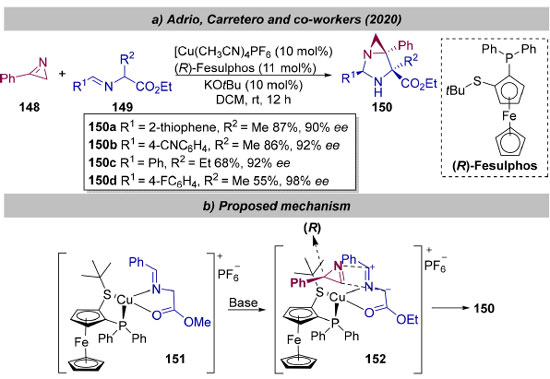 In a similar manner, Molina and co-workers have explored the reaction between 2H-azirines 148 and azomethine ylides generated in situ from 149 to synthesize a series of enantiomeric enriched 1,3-diazabicyclo[3.1.0]hexanes 150 using a Cu(I)/(R)-Fesulphos catalytic system (Scheme 28a).63 Importantly, moderate to good yields were observed for the imidazoline-type products, as well as a high degree of enantioselectivity (Scheme 28a). In the proposed mechanism, compound 149 initially coordinates to the catalyst, giving 151, which leads to 152 after coordinating with 148. Next, a 1,3-DC and elimination of the catalyst gives products 150 (Scheme 28b). It is important to highlight that the 2,3-disubstituted azirines approach the less hindered face of the chiral metallodipole, moving away from the tBu, the bulkiest group linked to the chiral catalyst.