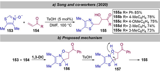In the same year, Li and co-workers reported the metal-free synthesis of thiazole-substituted α-hydroxy carbonyls 155 from thiazole N-oxide 153 and olefins 154 (Scheme 29).64 The proposed mechanism involves the 1,3-DC between 153 and 154, resulting in the cyclic intermediate 156, which is further protonated, giving 157, and then re-aromatization takes place, leading to the products 155 (Scheme 29b).