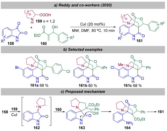 Synthesis of Other Heterocyclic Compounds Azomethine ylides are useful and highly reactive intermediates, which undergo a rapid cycloaddition with various olefins. Recently in 2020, Keesari and co-workers described the reaction of azomethine ylides generated in situ from isatins 158 and cyclic aminoacids 159 with Baylis-Hillman-type olefins 160 (Scheme 30).65 The use of such reagents in the presence of copper iodide under microwave irradiation proved to be a simple and rapid method to generate polycyclic frameworks 161 in a single step in moderate to good yields (Scheme 30b, 62-84%). In the proposed mechanism, isatin 158 initially reacts with aminoacid 159, furnishing azomethine ylide 162, which next undergoes a 1,3-DC reaction with 160, giving spiro-oxindole intermediate 163 (Scheme 30c). Subsequently, 163 undergoes a first intramolecular cyclization to produce 164, which after another intramolecular cyclization step, gives rise to product 161.
