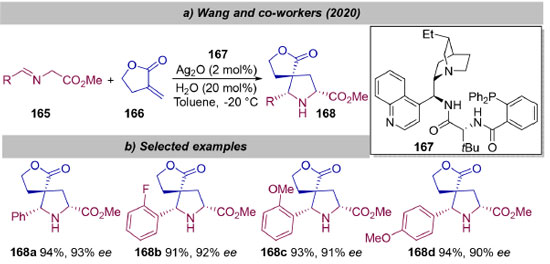 Also in 2020, Hou and co-workers reported the synthesis of spiro-pyrrolidines 168 through the enantioselective 1,3-DC azomethine ylides generated from 165 and α-methylene-δ-butyrolactone 166 (Scheme 31).66 In this case, cinchona-derived organocatalyst 167 was used in the presence of silver oxide, leading to the corresponding products in high yields and enantioselectivity (78-96% yield, 75-93% ee, Scheme 31b).