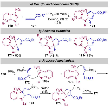 Jin and co-workers also gave their contribution to this field in 2019, having reported the reaction between nitroindoles 169 and dipoles formed from allenoates 170 to synthesize fused-indole derivatives 171 under phosphine catalysis (Scheme 32).67 Over 20 examples were synthesized using this protocol, and moderate to good yields were observed (Scheme 32b, 40-82%). The proposed mechanism starts with the transformation of the allene ester 170 into 1,3-dipole 172 in the presence of triphenyl phosphine, which next undergoes an addition step with nitroindole 169, giving transient intermediate 173 (Scheme 32c). Subsequently, an intramolecular cyclization step leads to intermediate 174, which upon proton shift, furnished 175. Finally, product 171 is formed upon the release of triphenyl phosphine.