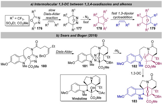 Carbonyl ylides are another type of dipole widely used in 1,3-DC reactions, affording polycyclic ring systems containing a tetrahydrofuran moiety. Due to their high reactivity, such compounds must be produced in situ, and are often obtained from the interaction of a carbene or metallocarbene with the oxygen atom of a carbonyl group.68 On the other hand, carbonyl ylides such as 178 can be obtained via the Diels-Alder reaction between 1,3,4-oxadiazoles 176 and alkenes followed by the elimination of molecular nitrogen (Scheme 33a).69 Inspired by these concepts, Sears and Boger developed an intramolecular version of this reaction and explored its applications in the synthesis of natural products (Scheme 33b).70 By using substrates containing both the initiating dienophile and subsequent dipolarophile tethered to the 1,3,4-oxadiazoles 180, this intramolecular Diels Alder/1,3-DC sequence allowed the use of diverse dienophiles and dipolarophiles, as well as unsymmetrical dienophiles and dipolarophiles with high regioselectivity. The protocol could be successfully applied to the synthesis of the alkaloids (-)-vindoline and (-)-vindorosine, and other natural products such as (+)-4-desacetoxyvindoline, (+)-4-desacetoxyvindorosine, minovine, (+)-N-methylaspidospermidine, (+)-spegazzinine and (−)-aspidospermine.