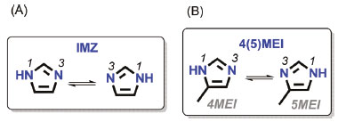 ![]() Figura 2. Tautômeros simétricos do IMZ (A) e tautômeros assimétricos do 4(5)MEI (B)