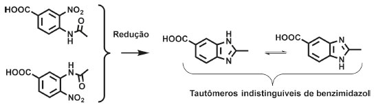 O IMZ possui o tautomerismo apresentado na Figura 2, mostrando que os nitrogênios N1 e N3 são equivalentes, ou seja, ora o nitrogênio N1 está ligado ao hidrogênio e seu par de elétrons comprometido com a aromaticidade ora o nitrogênio N3 tem o mesmo comportamento. Assim, tem-se para o IMZ dois tautômeros idênticos estruturalmente. Por outro lado, para IMZ substituídos, pode haver distinção, por exemplo, 4(5)-metilimidazol (4(5)-MEI), Figura 2. O tautomerismo do IMZ foi descoberto por Kaiser em 1888, que ao realizar a reação de redução do ácido 3-nitro-4-acetamidobenzóico ou do ácido 4-nitro-3-acetamidobenzóico, obteve o mesmo produto benzimidazol, conforme mostrado na Figura 3.5 Vale ressaltar que estudos com IMZ substituídos (exceto N-substituídos que não possuem tautomerismo) permitiram confirmar a existência dos tautômeros, reiterando que os nitrogênios N1 e N3 do IMZ (Figura 2) são idênticos.10,11 Outra característica é que o tautomerismo influencia nas diferentes razões entre isômeros de produtos obtidos de reações com derivados do IMZ que possuem tautômeros, e.g. 4(5)-substituído. Por exemplo, a metilação (com Me2SO4) do 4(5)MEI e 4(5)-nitroimidazol levam a uma proporção 1:2,2 e 350:1, respectivamente para os isômeros 1,5- e 1,4-substituídos.5 Ou seja, a reatividade do IMZ é afetada pelo tautomerismo, conforme será exemplificado mais adiante também.