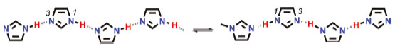 Para justificar a equivalência dos nitrogênios conforme mostrado nas Figuras 2 e 3, deve-se considerar o transporte do hidrogênio entre os nitrogênios, o que tem sido alvo de inúmeros estudos. Acredita-se que a transferência ocorre por uma combinação intermolecular e intramolecular.12 No mecanismo intramolecular, apesar de evidências que desfavorecem esse caminho, como efeito estérico, alguns autores confirmam esse transporte por espectroscopia Raman.12 De fato, muitos estudos descrevem uma maior contribuição do mecanismo intermolecular, apesar do intramolecular não ser descartado. No mecanismo intermolecular, as favoráveis interações de ligação de hidrogênio levam a longas cadeias de moléculas de IMZ alinhadas, e ocorre o transporte do hidrogênio do nitrogênio de uma molécula de IMZ para o nitrogênio de outra molécula de IMZ vizinha,13-19 conforme mostrado na Figura 4. O tautomerismo apresentado na Figura 4 pode ser estendido para outras estruturas de ressonância na Figura 1 e por isso, considera-se que há uma contribuição da deslocalização de carga e transferência de hidrogênio no tautomerismo do IMZ.20,21