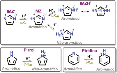 Com relação ao pKaH do IMZ, é menos básico que o análogo não aromático, imidazolina (pKa+NH = 11), no entanto, mais básico que piridina (pKa+NH = 5,5) ou pirrol (pKa+NH = -4). A basicidade anormal do IMZ é atribuída a baixa eletronegatividade dos nitrogênios e à estabilização da carga positiva da espécie protonada entre os nitrogênios equivalentes.22 Espera-se que IMZ seja menos básico que imidazolina, pois a aromaticidade é conhecida por diminuir a basicidade de aminas, devido ao seu caráter retirador de elétrons (e.g. piperidina tem pKaH 11,2, maior que piridina). No caso do pirrol, conforme discutido, devido ao par de elétrons do nitrogênio estar deslocalizado no anel, o nitrogênio é muito ácido e sua protonação é desfavorável pois leva a uma espécie não aromática. Finalmente, a maior acidez da piridina se deve por esta apresentar apenas um nitrogênio para estabilizar a carga positiva, em contraste com IMZ que possui dois nitrogênios onde a carga está deslocalizada (Figura 5).24 Conforme esperado, o pKaH do IMZ pode ser substancialmente afetado por grupos substituintes no anel. Por exemplo, 4(5)MEI possui pKaH = 7,52 devido ao efeito doador do grupo metila, aumentando a basicidade. Já grupos retiradores de elétrons aumentam a acidez, por exemplo, o 2-fenilimidazol e 4(5)-bromoimidazol possuem pKaH = 6,39 e pKaH =3,60, respectivamente.5 A reatividade do IMZ está intrinsicamente relacionada à sua especificidade estrutural, sendo que se espera que o ataque nucleofílico ocorra preferencialmente pelo nitrogênio N3,22 entretanto, os pares de elétrons do anel também podem agir como nucleófilos, como em reações com sais de arildiazônio.25 Para o caso da síntese de derivados de IMZ, as abordagens são diversificadas na literatura: a partir de compostos dicarbonílicos,26,27 frutose,28 ciclização de compostos aminocarbonílicos,29 a partir do próprio anel de IMZ e da histidina,30-32 rearranjos,25,33 reações multicomponentes,34,35 e muitos outros que fogem do objetivo dessa revisão. Ainda, a química peculiar do IMZ garante sua versatilidade catalítica pois pode atuar como catalisador, acelerando reações químicas e sendo recuperado no final, ou seja, não sendo consumido. Em sua forma protonada pode atuar como catalisador ácido e na forma neutra ou aniônica pode atuar como catalisador básico ou nucleófilo. De fato, a natureza tem nos mostrado que IMZ e catálise são um par perfeito, visto que muitos sítios enzimáticos possuem grupos IMZ que exercem múltiplas funções catalíticas com extrema eficiência. Não surpreende que o design de enzimas artificiais e outros modelos miméticos/não-miméticos tem se beneficiado de estruturas derivadas do IMZ.