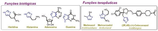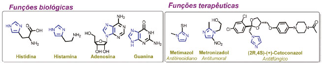IMIDAZOL PARA CATÁLISE: UMA LIÇÃO DOS SISTEMAS BIOLÓGICOS O IMZ é conhecido por sua fundamental importância biológica e terapêutica, conforme ilustrado na Figura 6. Nos sistemas biológicos, ele se encontra na forma do aminoácido histidina, compondo inúmeros sítios enzimáticos. Ainda, na forma da histamina, induz processos imunológicos,36-38 e compõe as bases adenosina e guanina dos ácidos nucléicos.22 Pelo viés terapêutico, é conhecida a atividade farmacológica de muitos derivados de IMZ, por exemplo como antifúngica, antitumoral, antibiótica, anti-histamínica, anticoagulante, anti-inflamatória, antibacteriana, antiviral, antidiabética, antimalárica, analgésica, gene delivery, entre outros.2,39-41 Realmente, existem muitos fármacos derivados de IMZ amplamente comercializados como metronizadol, cetoconazol, cimetidina, miconazol, omeprazol, dacarbazina, metimazol, entre outros.41