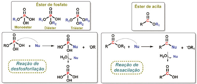 ![]() Figura 18. Esquema geral de reações de desacilação e desfosforilação nucleofílicas promovidas pelo IMZ52,128-130