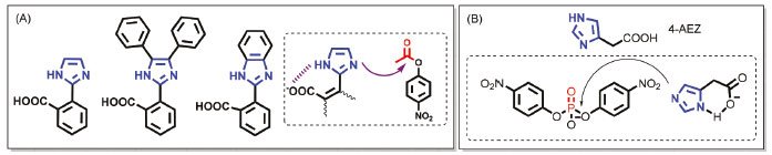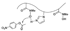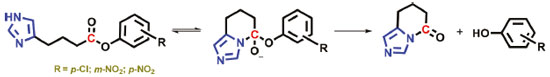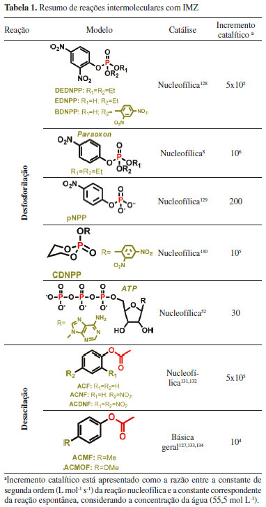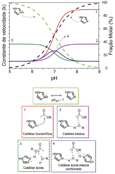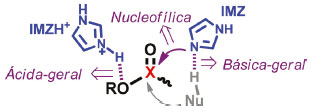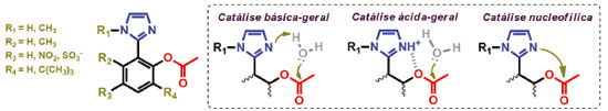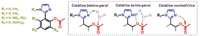 A hidrólise de uma série de ésteres derivados do acetato de (imidazo-2-il) fenila (Figura 16) foi descrita, na qual o tipo de catálise intramolecular é determinado pela estrutura do éster devido a efeitos estéricos e eletrônicos. Assim, o grupo IMZ protonado atua como catalisador ácido-geral, assistindo a eliminação do grupo de saída, concomitante ao ataque da água no carbono do grupo da carbonila. Ainda, quando neutro, IMZ pode atuar como catalisador básico-geral auxiliando no ataque nucleofílico da água ou como nucleófilo, formando um intermediário tipo acetilimidazol, que rapidamente transfere o grupo acetila para água. Os incrementos catalíticos observados devido ao IMZ foram tipicamente 104 vezes.119-121