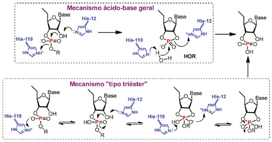 ![]() Figura 14. Mecanismos de catálise ácida e nucleofílica-ácida intramolecular como modelos de RNase114