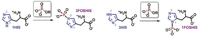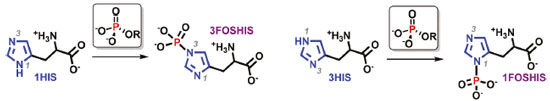 Existe uma grande discussão48,76,77 com relação à forma de atuação das RNase A, mas em geral evidências experimentais apontam para o mecanismo clássico ácido-base geral. Por exemplo, o perfil de pH em forma de sino, dados cristalográficos, efeitos isotópicos cinéticos com 18O e análises de tio-efeitos em que a substituição do oxigênio da fosforila por enxofre não reduz a velocidade da reação, como esperado se ocorresse pelo mecanismo "tipo triéster".77,78 Estudos mostram que as RNase A são promissoras no diagnóstico e tratamento terapêutico, como câncer. Isso porque a quantidade de RNases aumenta no corpo humano quando ocorre disfunções como doenças, o que pode ser regulada por ativadores ou inibidores (i.e. fármacos).79 Ainda, a citotoxicidade das RNase A frente a células cancerígenas tem mostrado potencial como agente terapêutico, por ser biocompatível e causar menor efeito colateral que os agentes quimioterápicos mais usuais.80 Fosfohistidinas As reações reversíveis de fosforilação com proteínas são chave em inúmeros processos de sinalização e regulação celular.81 Esses processos podem ocorrer pela O-fosforilação levando a fosfoserina, fosfotreonina e fosfotirosina ou pela N-fosforilação, formando fosforamidatos.82 Nos sistemas biológicos, os diferentes tautômeros da histidina, 1-histidina (1HIS) e 3-histidina (3HIS) levam aos fosforamidatos 3-fosfohistidina (3FOSHIS) e 1-fosfohistidina (1FOSHIS), respectivamente, conforme mostrado na Figura 10.50,83 Estudos apontam que o isômero 3HIS é preferido nos sistemas biológicos84 e ainda que 1FOSHIS é menos estável, podendo até se converter na 3FOSHIS.85 Assim, a preferência pelo isômero 3HIS nos sistemas biológicos, que leva ao instável fosforamidato 1FOSHIS, é consistente com o papel das fosfohistidinas de promover reações de fosforilações reversíveis e rápidas.