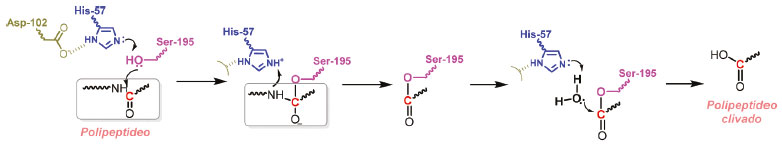 Enquanto nas bactérias a função das fosfohistidinas está consolidada, seu papel nos vertebrados ainda não está esclarecido e seus estudos são recentes.50,81 A nucleosídeo-difosfato-quinase foi a primeira enzima onde se detectou a participação das fosfoshistidinas nos vertebrados, em 1968.96 A correlação das fosfohistidinas com processos de sinalizações importantes, e.g. G-proteínas,97 foi próximo de 1990 e a caracterização estrutural da quinase e fosfatase, envolvidas no processo ocorreram apenas no ano de 2003.98 Não obstante, os processos de sinalização através de reações reversíveis de fosforilações da histidina parecem ser universais, justificando a importância em compreender esses processos, que são particularmente promissores na compreensão do mecanismo de resistência a antibióticos das bactérias e no desenvolvimento de novos fármacos.99-101 Outro interesse pelas fosfohistidinas pelo viés terapêutico é no caso de uma fosforilação anormal que pode estar correlacionado a muitas doenças, como o câncer e doenças inflamatórias crônicas.102 Nesse contexto, o desenvolvimento de inibidores de quinases de histidina tem potencial e alguns estudos envolvendo detecção de câncer tem se mostrado bem sucedidos,94 no entanto, a dificuldade em obter anticorpos de fosfohistidina atrasa significativamente os avanços nessa área.100,103 Quimotripsinas Enquanto nas reações enzimáticas de desfosforilação, a histidina pode atuar tanto como catalisador nucleofílico e ácido-base geral, nas reações de desacilação, o papel da histidina em geral é de ácido-base-geral, por exemplo, a a-quimotripsina. A quimotripsina é uma enzima digestiva que contem 245 aminoácidos e atua na clivagem de ligação peptídica.104 Sua forma de atuação está ilustrada na Figura 12 onde envolve principalmente os resíduos His-57, serina (Ser-195) e ácido aspártico (Asp-102), formando a tríade catalítica. Inicialmente, os resíduos Asp-102 e His-102 atuam como catalisador básico-geral auxiliando o ataque nucleofílico do grupo alcóxido da Ser-195 no carbono eletrofílico do polipeptídeo. Em seguida, o intermediário tetraédrico formado se decompõe levando à enzima acilada, se beneficiando de uma catálise ácida-geral da His-57. Por fim, ocorre a desacilação da enzima pelo ataque nucleofílico da água onde a His-57 atua como catalisador básico-geral.69,105,106