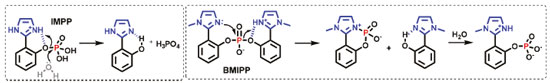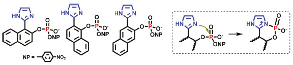 Já para BMIPP, um mecanismo bifuncional bastante elegante foi proposto, onde sua hidrólise é 1011 vezes mais rápida que a hidrólise do fosfato de difenila. No entanto, ao comparar com um fosfato de diarila com grupo de saída de pKa similar ao BMIPP (~7,85), a catálise no BMIPP chega a 107 vezes, muito impressionante para um modelo intramolecular.67 Estudos cinéticos para reação de hidrólise do BMIPP mostram um perfil de pH em forma de sino com reatividade máxima para a espécie bipolar (pH ~ 6,5) apresentada na Figura 14. Inicialmente, o mecanismo proposto para BMIPP envolvia um grupo IMZ protonado e outro neutro promovendo simultaneamente catálise ácida e básica geral, respectivamente, tal como ocorre nas RNAse.67 Todavia, novas evidências (espectrometria de massa de alta resolução e cálculos computacionais) apontam para um mecanismo bifuncional onde um grupo IMZ neutro atua como catalisador nucleofílico, enquanto outro IMZ protonado promove catálise ácida-geral, também recorrente em processos biológicos.115 Esse mecanismo leva a um intermediário cíclico instável que foi detectado por espectrometria de massas, e rapidamente se decompõe para um monóester de fosfato, análogo do IMPP.116 Ainda assim, uma catálise bifuncional ácida-básica-geral não pode ser totalmente descartada, podendo ainda ocorrer em alguma proporção. A catálise nucleofílica intramolecular do IMZ também foi observada nos derivados de fosfato de o-(2'-imidazolil)naftila e (4-nitrofenila) (Figura 15), com incrementos catalíticos de ~ 107 vezes. Os intermediários cíclicos formados pelo ataque nucleofílico do IMZ foram detectados e se mostraram surpreendentemente estáveis.117 Outro modelo utilizado avaliou a reatividade dos fosforilimidazois através de reações de hidrólise onde através de calculos teóricos e técnicas experimentais se observou um estado de transição solto, devido a fraca ligação P-N amídica.118