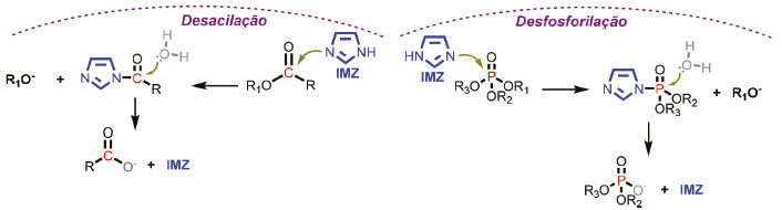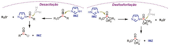 Um mecanismo geral para as reações de desfosforilação e desacilação catalisada nucleofilicamente pelo IMZ está representado na Figura 18,52,128-130 em que inicialmente o IMZ ataca o átomo de fósforo levando a um intermediário fosforilado. Esse intermediário é rapidamente hidrolisado devido a instável ligação entre o fósforo e o nitrogênio imínico. Para as reações com ésteres carboxílicos o mecanismo é semelhante, com a formação de um intermediário acetil-IMZ.135 Ele tem sido amplamente avaliado buscando compreender a transferência do grupo acila.136-138 A detecção dos intermediários de IMZ fosforilados e acilados fundamentam os estudos de mecanismos dessas reações. Além disso, auxiliam na compreensão de processos biológicos e no caso dos fosforilimidazois existe o potencial desenvolvimento de moléculas biosinalizadoras com fins terapêuticos.128