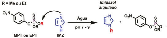Para as reações nucleofílicas de desacilação, diversos derivados de IMZ foram estudados e se observou que o aumento da basicidade do catalisador nucleofílico aumenta sua reatividade, exceto em casos de impedimento estérico, conforme previsto pelo gráfico linear de Bronsted para log kN vs pKa Nu.126,139 O mesmo comportamento linear também já foi observado em reações de desfosforilação, sendo avaliadas uma gama menor de derivados de IMZ (vide infra). Surpreendentemente, na reação com ésteres tiofosfóricos Paratíona etílica (EPT) e metílica (MPT), o IMZ ataca nucleofilicamente os carbonos alifáticos, sendo obtidos como produtos IMZ N-alquilados (Figura 19) com incrementos de 7x103 e 1x105 para as reações com o EPT e MPT, respectivamente, mostrando que o IMZ cliva os mesmos com eficiência, apesar de não ser um processo catalítico.140,141 Esse resultado evidencia o potencial de agente alquilante desses pesticidas, podendo essa reação ser utilizada para síntese de alquilimidazois em condições brandas de pH e solvente aquoso. Esse comportamento é pouco observado em reações com IMZ, onde espera-se que o mesmo ataque o átomo de fósforo. Entretanto, comportamento similar já havia sido observado para o 1-MEI em solvente orgânico.142