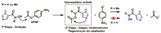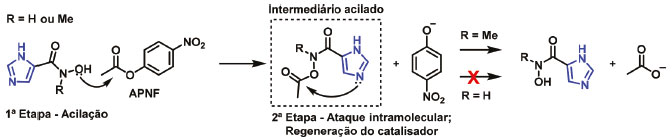 Outras formas de catálise cooperativa são os derivados de IMZ bifuncionais, isso é, aqueles que podem combinar dois sítios ativos. Reações de desacilação do APNF com derivados de IMZ combinados com ácido hidroxâmico (conhecidos como potentes nucleófilos) foram estudadas a fim de compreender efeitos de uma catálise cooperativa (Figura 21).146 Quando o grupamento R escolhido foi metila, o intermediário de reação acilado foi atacado e clivado pelo anel de IMZ vizinho. Entretanto, apesar de uma molécula pequena ser capaz de promover uma reação de catálise bifuncional os valores de constante velocidade para a etapa de regeneração do catalisador não foram tão altos (não observado quando R = H e 5,92x10-4 s-1 para o quando R = Me) como esperado pelos autores do estudo.