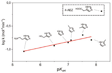 O efeito de substituintes em imidazóis Como discutido anteriormente, os substituintes presentes no IMZ modificam algumas das características físicas e químicas desses compostos. Um dos parâmetros termodinâmicos que mais afetam a reatividade dos derivados IMZ substituídos é o pKaH, uma vez que a basicidade está ligada intimamente a atividade catalítica nucleofílica e ácida-básica. Em um estudo anterior, Komyama mostrou que para a reação de desfosforilação do BDNPP, a reatividade de uma série de derivados de IMZ tem uma relação linear com pKaH (Gráfico de Bronsted; Figura 22), exceto para o 4-AEZ (Figura 22), que apresenta combinação de catálise básica e nucleofílica (vide supra, Figura 20).144
