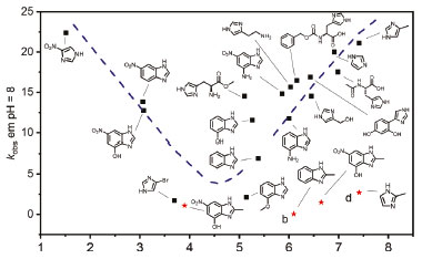 Assim, como a reatividade dos derivados de IMZ para o APNF é governado pela basicidade (i.e. pKaH e pKa; relação de Bronsted linear) os autores deduziram uma equação para prever as constantes de velocidade de acordo com os valores de pKa e pKaH para cada derivado de IMZ. A Figura 24 apresenta os dados experimentais para uma série de derivados de IMZ, na reação de desacilação, em que é possível observar que a equação prevista segue a tendência dos dados experimentais para os derivados substituídos nas posições 4 e 5 do anel. Entretanto, quando são avaliados derivados substituídos na posição 2 do anel, os dados experimentais desviam do esperado quando considerados apenas os respectivos valores de pKaH, evidenciando que o fator estérico tem importância crucial na diminuição da reatividade.147