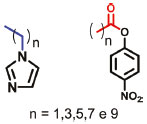 ![]() Figura 25. Influência de grupamentos alquílicos na reatividade de derivados de IMZ N-alquilados nas reações de desacilação de ésteres de cadeia longa e curta149