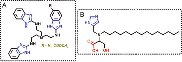 ![]() Figura 26. Derivados de IMZ (A) (tris aminobenzil imidazol) e (B) (4(5) (aminometil)(N-pentadecil serino)imidazol capazes de agir como enzimas artificiais150,154