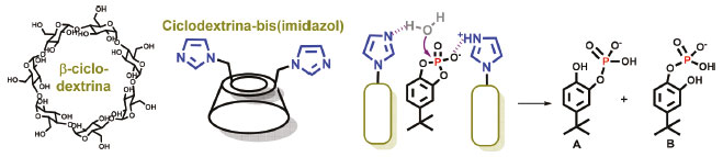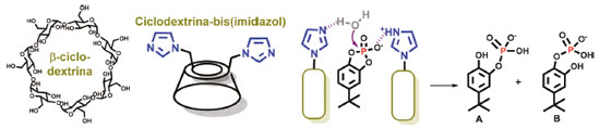 Outro polímero que teve a atividade catalítica avaliada foi o ácido poliacrílico funcionalizado com grupos IMZ (PAIM). O PAIM apresentou proporção 1:1 de IMZ e ácidos carboxílicos172 e se mostrou bastante eficiente em reações de desfosforilação e desacilação de ésteres ativados, com incrementos catalíticos na ordem de 7x105 vezes para o DEDNPP. Ainda quando combinados com o surfactante CTAB, o incremento catalítico do polímero foi ainda maior, na ordem de 106 vezes em relação a hidrólise espontânea, atribuída a formação de agregados supramoleculares que seriam capazes de formar bolsões hidrofílicos que acomodariam o substrato DEDNPP, facilitando a reação.173 Recentemente Nothling e colaboradores descreveram a síntese de uma catalisador, na qual foram ancorados na resina de Merrifield uma molécula contendo os grupos hidroxila, ácido carboxílico e IMZ próximos, com intuito de mimetizar as esterases. Nesse caso, foi mostrado que os três grupos são importantes para a aumentar a velocidade da reação com o substrato escolhido butirato de p-nitrofenila e que a retirada de qualquer desses grupos diminui a atividade catalítica.174 Outros sistemas poliméricos combinados com o IMZ, utilizados como catalisadores estão descritos na literatura e evidenciam a ampla potencialidade dessa combinação como em polímeros de acrilamida,175 copolímeros de vinilimidazol,176 poli 4(5)vinilimidazol,177 poliestireno,178 e ácido acrílico.179 Outro suporte interessante para enzimas artificiais são as ciclodextrinas. Breslow e colaboradores,163,180 propuseram um modelo de RNase ancorando grupos IMZ na b-ciclodextrina levando a ciclodextrina-bis(imidazol) que foi extensivamente estudada na reação de hidrólise do fosfato de 4-terc-butilcatecol, Figura 29. Resultados indicam um elegante mecanismo de catálise bifuncional ácida-básica geral pelos grupos IMZ, tal ilustrado na Figura 29, com incrementos catalíticos de 120 vezes.181 A dependência da reação com a posição dos grupos IMZ na ciclodextrina está de acordo com um mecanismo onde um grupo IMZ desprotonado atua como base-geral, auxiliando no ataque nucleofílico da água no éster, enquanto outro grupo IMZ protonado atua como ácido-geral amparando a clivagem do éster cíclico. Ainda, observou-se uma alta seletividade (> 99:1) para o isômero A (Figura 29), em comparação com a hidrólise básica que leva a uma mistura dos dois produtos.182