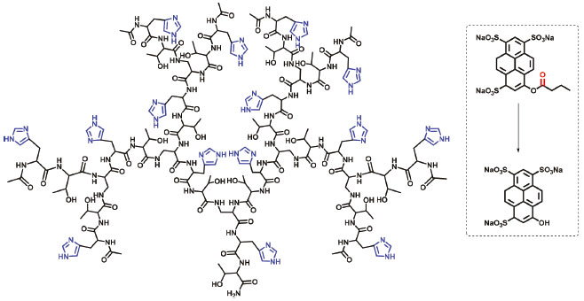 Outra classe interessante de modelos macromoleculares são os dendrímeros que possuem ramificações simétricas de unidades menores e caracterizam-se por apresentar uma região hidrofóbica (interna) e hidrofílica (superficial). Ainda, os dendrímeros são particularmente promissores devido a sua maior monodispersidade comparada aos polímeros, ideal no design de enzimas artificiais, pois as enzimas biológicas são monodispersas, i.e. possuem unidades moleculares uniformes em termos de massas moleculares. Um estudo mostrou que o dendrímero com grupos histidina mostrado na Figura 30 atua como catalisador na reação de hidrólise de 8-butiloxipireno-1,3,6-trisulfonatos, com incrementos catalíticos de 9 x 104 vezes. Sua forma de atuação foi atribuída a fatores hidrofóbicos, e ao grupo IMZ que pode atuar como nucleófilo ou catalisador básico-geral.183