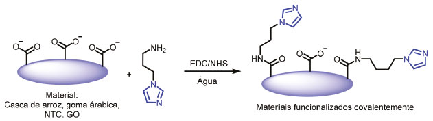 Diversos materiais derivados de biopolímeros, resíduos agrícolas e nanomateriais de carbono vem sendo utilizados como suportes para obter catalisadores derivados de IMZ, que tem mostrado efeitos sinérgicos.184-187 Uma das abordagens é a funcionalização covalente pois garante que os grupos reativos permaneçam no suporte após vários ciclos e não lixiviem facilmente. A funcionalização desses materiais se baseia na formação de ligações amida, partindo do derivado de IMZ 1-amino-3-propilimidazol e dos grupos ácidos carboxílicos presentes no material de interesse, através da ativação da carboxila com reagentes etilenocarbodiimida (EDC) e N-hidroxisuccinimida (NHS) (Figura 31).188 Para esses compósitos, quando considerados apenas a quantidade de grupos IMZ, eles se mostraram muito superiores que o IMZ livre, evidenciando a potencialidade e sinergia desses materiais para aplicações em catálise. Materiais como o óxido de grafeno (GO) na forma de pó e de filmes finos apresentaram interessante atividade catalítica frente a reações de desfosforilação, reduzindo o tempo de meia vida do pesticida Paraoxon de mais de 516 anos para apenas 1 mês no caso do compósito na forma de pó e para 13 dias para o compósito na forma de filme, além da manutenção da atividade catalítica após vários ciclos de uso.185 Nanotubos de carbono (NTC) magnéticos também foram funcionalizados com IMZ, que além dos altos incrementos catalíticos na decomposição do Paraoxon na ordem de 107 vezes apresentam a característica de serem facilmente removidos do meio reacional com um imã.186 Catalisadores derivados de lixo agrícola também foram obtidos. De fato, a casca de arroz, um derivado celulósico, é um dos maiores resíduos da agroindústria e com o objetivo de agregar valor a esse resíduo, o mesmo foi funcionalizado com IMZ e utilizado como catalisador em reações de desfosforilação.184 Para esse caso também a atividade catalítica se mostrou bastante alta, promovendo a clivagem do Paraoxon com incremento catalítico de 107 vezes, sob condições brandas (30 °C e pH 8,5). A goma arábica, um biopolímero, quando funcionalizado com IMZ apresentou incrementos catalíticos de 105 vezes para a degradação do DEDNPP, sendo capaz de, inclusive, quebrar o DNA plasmídico, evidenciando o potencial dos biopolímeros funcionalizados como enzimas artificiais.187