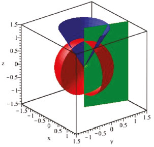![]() Figure 7. Definition of spheroconical coordinates: surfaces of a sphere (green) centered at the origin with r = 2/5 units, an infinite double cone (red) of elliptical cross section about axis z with ξ = ¼, and a second infinite double cone (blue) of elliptical cross section about axis ξ with ƞ = ¼. The domains are 0 ≤ r < ∞, -1/√2 ≤ ξ,ƞ ≤ +1/√2