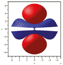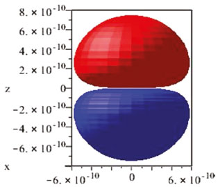 ![]() Figure 2. Surface of ψ0,1,0(r,θ,ϕ) = ±3.17×1012 m−3/2; the upper lobe (red) has a positive phase, the lower lobe (blue) has a negative phase. The length scale on each axis is in terms of metre consistent with the SI units of the plotted function