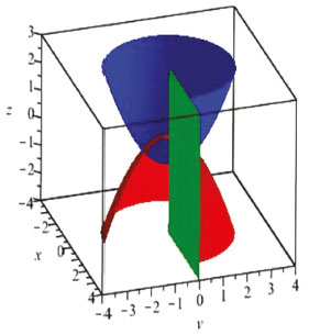 ![]() Figure 3. Definition of paraboloidal coordinates: a paraboloid (red) for u = 1 unit with its focus at the origin and opening downward, cut open to show the interior; a paraboloid (blue) for v = 1 unit with its focus at the origin and opening upward, likewise cut open; a half-plane (green) for ϕ = 0 is, accordingly, in plane xz for which ψ = 0. The domains are 0 ≤ u,v < ∞, 0 ≤ ϕ < πp