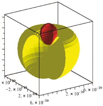 ![]() Figure 4. Surface of ψ0,1,0(u,v,ϕ) = ±1.46×1013 m−3/2; the lower lobe (yellow) has a positive phase, the upper lobe (brown) negative phase; both are cut open to reveal the details of the surfaces. The length scale on each axis is in terms of metres consistent with SI units of the plotted function