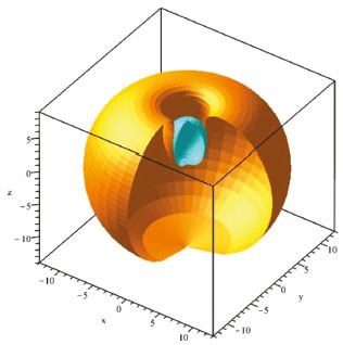 ![]() Figure 6. Surface of ψ2,0,0(ξ,ƞ,ɸ) = ±2.13×10−4 aµ−3/2 at d = 5 aµ; the small lobe (light blue) of nearly ellipsoidal shape has a negative phase, the large lobe (coral) has a positive phase; both are cut open to reveal the inner details. The axes are scaled in unit aµ