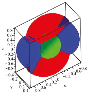 ![]() Figure 8. Surface of ψ0,0,1(ξ,r,ƞ) = ±0.0041 aµ−3/2; the double conical lobe (red) with its apices at the origin has a positive phase; the torus (blue) about axis ξ has a negative phase. The axes are scaled in unit aµ. The surface is cut open to show the interior