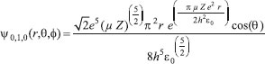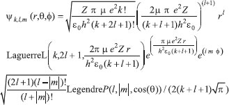 The solutions ψk,l,m(r,θ,ɸ) to the Schroedinger equation independent of time in these spherical polar coordinates, i.e. the orbitals, are expressible as ![]() In this equation that is deliberately expressed in terms of fundamental physical constants appear as parameters quantum numbers radial k, as first argument of generalized Laguerre functions denoted LaguerreL with coordinate r, azimuthal l as first argument of associated Legendre functions of the first kind and denoted LegendreP with coordinate q, and equatorial m that is coefficient of equatorial angle ϕ and i = √-1 in an exponential function. Other symbols are atomic number Z, reduced mass m = me mp /(me + mp) of the atomic system for which Z = 1 for H with a proton of mass mp as atomic nucleus, electric charge −e for an electron of mass me, Planck constant h and electric permittivity e0 of vacuum. In terms of quantum numbers specific for this coordinate system, energy quantum number n from experiment is equal to k + l + 1. These quantum numbers k,l,m that arise directly in the solution of the Schroedinger equation in spherical polar coordinates are natural descriptors for this system because they specify the number of nodal surfaces associated with each respective coordinate r,θ,ϕ. As that equation for an amplitude function as orbital comprises three independent variables as coordinates r, θ, ϕ and one dependent variable as amplitude y, a plot of such a function would require four spatial dimensions, which is impracticable. We hence show a surface of constant ψ at a value chosen to reveal the essential geometric features; the value of ψ is explicitly chosen, here and below, such that the surface of y2 at that value would contain about 0.99 of the total electronic charge density. For quantum numbers k = 0, l = 1, m = 0, so n = 2, the amplitude function (commonly known as orbital 2p) has this explicit algebraic form in terms of fundamental parameters: ![]() A plot of the surface of this amplitude function or orbital, according to the stated criterion, appears in Figure 2. The surface comprises two separate hemispheres, of opposite phase on either side of plane xy for which z = 0, and with rounded edges; the overall nearly spherical shape is consistent with the fact that the Coulombic attraction between an electron and a proton has no angular dependence.