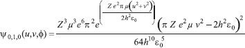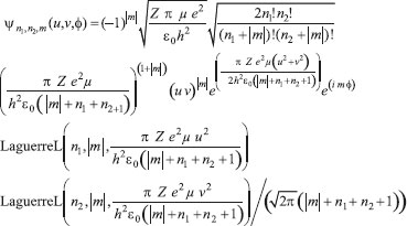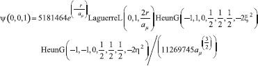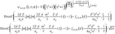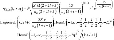 ![]() Figure 5. Definition of ellipsoidal coordinates: surfaces of an ellipsoid (red) with ξ = 2, an hyperboloid (blue) with ƞ = π/4 rad, both cut open to reveal the inner details, and a half-plane (green) with ϕ = π/3 rad. The axes are scaled in unit aµ, which signifies a Bohr radius corrected for reduced mass µ of the system. The domains are 1 ≤ ξ < ∞, -1 ≤ ƞ ≤ 1, 0 ≤ ϕ < πp