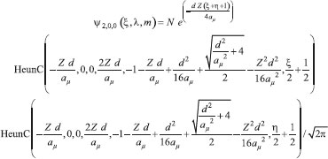 The solutions ψn,l,m(ξ,ƞ,ɸ) of the Schroedinger equation independent of time in these ellipsoidal coordinates, i.e. the orbitals, are expressible as ![]() In this equation that is expressed in terms of am, which signifies a Bohr radius a0 corrected for the reduced mass of the system, am = e0 h2/(p m Z e2) with am = me a0/m for effective reduced mass m of the atomic system, appear normalizing factor N and quantum numbers n, l and equatorial m that is again coefficient of equatorial angle ϕ and i = √-1 in an exponential function; the distance between the two foci of the ellipsoid is given symbol d, and all amplitude functions depend sensitively on the value of this parameter. Because Schroedinger's equation in these coordinates is a special case of Heun's differential equation, confluent functions HeunC naturally appear in the solutions; there is no singularity of these functions within the defined domains in the caption of Figure 5. In this formula energy quantum number n appears directly, but, in an alternative and partial solution in terms of variables ξ and ƞ in separate series,10 n = nx + nh + |m| + 1. For quantum numbers n = 2, l = 0, m = 0, the amplitude function or orbital has this explicit algebraic form in terms of Bohr radius am: ![]() According to the same criterion as for ψ0,1,0(r,θ,ɸ) in Figure 2, we show in Figure 6 a surface of this amplitude function ψ2,0,0(ξ,ƞ,ɸ), at a value of d chosen to reveal the essential geometric features. The surface comprises two lobes, a small lobe nearly ellipsoidal and of negative phase along axis z, and a large lobe of positive phase. At distances d < am/10, the inner lobe begins as a sphere with its center at the origin (not shown) inside a concentric shell of amplitude of opposite phase; with increasing d the lobe assumes an ellipsoidal shape and moves upward along positive axis z and eventually separates from the large lobe as in Figure 4.