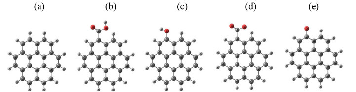 ![]() Figure 1. Activated carbon computational models: (a) coronene; the surface groups attached to the edge of AC: (b) coronene with carboxylic group (COOH) and (c) coronene with hydroxyl group (OH); and the chemical modifications of the surface groups: (d) coronene with deprotonated carboxylic group (COO-) and (e) coronene and deprotonated hydroxyl group (O-)