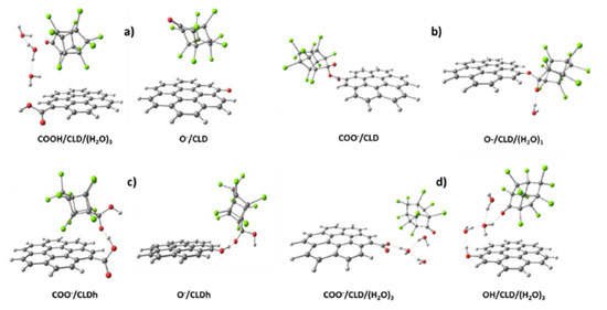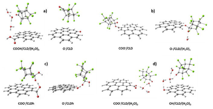 ![]() Figure 3. Three distinctive interaction types of CLD with protonated and deprotonated COOH and OH acidic surface groups onto AC. a) Cl···π-cloud interaction; b) O-···CO interaction and c) C-OH···O- interaction. Note in d) how water molecules network is between CLD and SGs. MMH/PM7