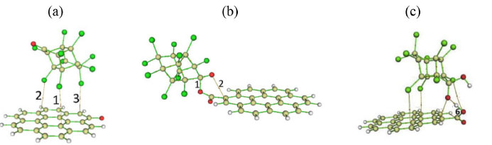 Taking into consideration the association energies values, the affinity order of water molecules and SG was found to be COO- > O- > COOH > OH > coronene.32,33 On the other hand, COO-, O- and COOH surface groups are been saturated when one molecule of water is added to the systems. However, to saturate OH surface group and coronene molecule two or three water molecules are required. Three distinctive interaction types were obtained as result of MMH calculations (See Figure 3). The first interaction type was predominant and it was observed between the chlorine atoms of CLD and chlordecone hydrate with the π-cloud of coronene, indicating a relatively weak interaction (Figure 3a). The bonding distance was in the range of 2.3 and 3.0 Å, suggesting van der Waals interactions between Cl atoms of CLD and CLDh and the planar configuration of coronene molecule. In fact, Gamboa-Carballo et al.,32 and Melchor-Rodríguez et al.,33 reported as results of QTAIM evaluation that the dispersive interactions are mainly due van der Waals forces between chlorine atoms of pesticide and the graphitic surface in AC (see Figure 4a and Table 2).