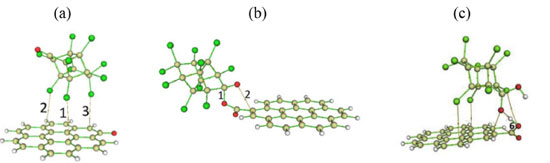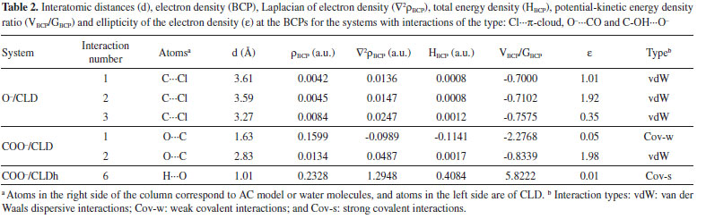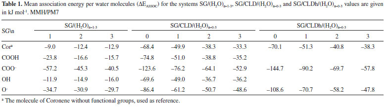 RESULTS AND DISCUSSION Recent computational results of chlordecone interactions with activated carbons acidic surface functional groups Theoretical models that can properly describe the AC constitution, morphology and topology generally tend to be more computationally expensive. For that reason, simplest molecular structures such as: polycycles and their oxidized derivatives, are frequently employed as models of carbon based materials.53-56 Indeed, naphthalene,27,57,58 coronene,31-33,55,59,60 and their oxidized derivatives have been frequently used in theoretical studies that characterize and evaluate interactions of different molecules with these materials. According to that, and with the aim to center the attention on the influence of AC acidic surface groups on adsorption process of CLD, the molecule of coronene, with and without a functional group attached to the edge, was used as activated carbon model. It can be seen in Figure 1, that graphene structure provides the aromatic character to the models, while the SGs at the edges of AC define the acidic or basic properties of activated carbon. As acidic surface groups, carboxylic acid (COOH) and hydroxyl (OH) groups, directly attached to sp2 carbons were selected, since both are the most commonly abundant oxygenated SGs found on AC surface.61,62 To consider different pH conditions, deprotonated models with COO- and O- were also studied. The coronene alone was used as a reference. The water molecules were included to evaluate the explicit solvent effect in the adsorption process. This AC models were employed by Gamboa-Carballo et al.,32 and Melchor-Rodríguez et al.,33 when they studied the interaction of CLD and CLDh with functionalized AC at acidic, neutral and basic conditions. From their side, Hernández-Valdés et al.,31 used it for evaluating the interactions of paracetamol and 125I-paracetamol with AC surface groups f. However, Enriquez-Victorero et al.,27 published a theoretical study of γ- and β-HCH isomers interaction with AC surface groups, using the molecule of naphthalene as AC model.
