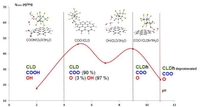 As a second interaction type, a donor-acceptor interaction can be described between the negatively charged oxygen of surface groups (COO- and O-) and electronically deficient carbonyl carbon of chlordecone: O-···CO (Figure 3b). We have underline that this interaction has not been previously described and it was observed only at slightly acidic and neutral pH conditions. One of the most interesting finding of Gamboa-Caraballo et al.,32 is the fact that this second interaction type is only present in charged systems. In that work, "the bonding distance between the charged oxygen of the SG and the carbonylic carbon of the CLD was in the range between 1.5 and 1.6 Å as results of MMH calculations. However, QTAIM calculations showed a few structures with O-···CO interactions with weak to strong covalent bonds (See Figure 4b and Table 2). This result ratifies the idea of chemical sorption at slightly acidic and neutral pH conditions and reinforced the experimental results obtained by Durimel et al.,18 through a temperature-programmed desorption studies showing that carboxylic groups at AC surface plays a major role for CLD adsorption".32 The third interaction type consists on an electrostatic interaction between the di-alcohol group of CLDh molecule and the negatively charged oxygen of SGs, represented as C-OH···O- (Figure 3c). QTAIM results confirmed this kind of interaction as seen on Figure 4c and Table 2. We have to point out that this interaction was found only at vacuum, it means in absence of water molecules. For that reason, are will not discuss it profusely here. More information about it can be founded in the recent publication of Melchor-Rodríguez et al.33 It is important to say that the formation of H-bonds and H-bond clusters of water molecules, when one or two molecules of water are close to the interaction site, has be also described through C-OH···OH2 hydrogen bonds (Figure 3d). On the other hand, concerning the aromaticity of activated carbon, two main effects have been perceived in the systems under study: 1) interactions that involve delocalized electrons of the aromatic model and, 2) the electron density stabilization was in the negatively charged SGs (COO- and O-). The DFT optimization of selected structures using CAM B3LYP/6 31+G(d,p)41 and M06-2X functional,33 showed in most of the cases that the structures conserved their geometry and the interaction type. However, some differences for the interactions Cl···p-cloud were observed: while for MMH methodology with PM7 semiempirical Hamiltonian the mean interaction distances were about 2.7 Å, while DFT re-optimizations result in an average of 3.6 Å. Then, it can be assumed that PM7 overestimates this kind of dispersive interactions. However, this brings an improvement in the description of other molecular properties, qualitatively describing the complexes in terms of interactions types.32 Taking into account the ΔEASSOC of the SG/CLD/(H2O)n=1-3 and the SG/CLDh/(H2O)n=1-3 systems, it was confirmed that there is no significant difference between obtained values of ΔEASSOC at acidic, neutral and basic pH.32,33 Once again, this behavior is in agreement with practical evidences reported by Durimel et al.,18 through adsorption isotherms, confirming that the best pH for chlordecone adsorption on activated carbons with acidic SGs ranges between 5 and 9. Summing up, at acid pH where COOH and OH remain mostly in neutral forms, a very small dependence of chlordecone adsorption process on surface groups was observed. However, "at pH ≈ 5-7, a rough estimation gives a deprotonation of OH surface groups lower than 3 %, while only COOH groups are deprotonated to a considerable extent, around 90 %".60 Then, it can be concluded that carboxylic SGs will be main contributors to improve the adsorption of chlordecone onto activated carbons at slightly acidic and neutral pH, as demonstrated theoretical calculations,32 confirming experimental facts.18 These results suggested the possibility of chemisorption of chlordecone on charged surface groups, mainly for COO- at neutral pH. However, at pH > 9 "both functional groups are totally deprotonated and the CLD form CLD hydrate". Therefore, from theoretical results obtained by Melchor-Rodríguez et al.,33 we can summarize that "the interaction of CLDh with the acidic surface groups is favored through a dispersive and electrostatic interactions. The dispersive interactions are governed by van der Waals interactions of chlorine atoms of CLDh with the graphitic surface and electrostatic interactions by H-bonding interactions of CLDh with SGs on AC in presence of water molecules. Finally, at pH > 12 it is suggested that the adsorption of CLD decreases again because repulsion interactions are being expected between the deprotonated CLD hydrate and the deprotonated acidic surface groups as well. Considering that, the mechanism of adsorption of CLD on acidic activated carbons at a range of pH≈ 5-7 occurs by chemisorption and physisorption and at basic pH conditions by physisorption" (See Figure 5).