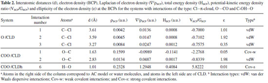 COMPUTATIONAL METHODS Computational chemistry as a tool for understanding the adsorption process of CLD onto AC Some years ago, the techniques of computational and theoretical chemistry were used only by experts extremely experienced in the use of the tools they offer, which in most cases were difficult to understand and apply. However, at present, advances in software have produced programs that are more easily used by any chemist. The use of computational chemistry allows reducing the delays for developing and obtaining new products; optimizing existing processes to improve energy efficiency and minimizing wastes. It also allows the efficient design of new processes and products; improving health, social welfare and environmental conditions; understanding what is happening and predicting phenomena at nano and picoscales. In this sense, computational chemistry plays an important role in understanding the adsorption process of CLD onto functionalized AC under different pH and hydrated conditions and for the design of specific modifications that guarantee the production of more efficient and specific adsorbents for removing chlordecone from water, improving the AC selection process. A computational approach for studying interactions of pollutants with surface groups of AC For the evaluation of the adsorption energies of the guest molecules in carbon-based material models, computational methods have been widely used. However, the description of interactions between adsorbant and AC surfaces still represents a challenge for the scientific community using current theoretical techniques.27 Concerning that, a general computational methodology has been proposed by the authors that consist in two main steps.27,31,32 First, the Multiple Minima Hypersurface methodology (MMH) is used to explore the configurational space of the CLD interactions with the selected acid surface groups onto activated carbon. Afterwards, distinctive minima structures are selected that represent the possible types of interaction in the systems under study. The condition, for the geometrically representative structures selection is based on general chemical knowledge, in view of the structures of global minimums and local minimums, close to latter. Second, the selected distinctive minima structures obtained from MMH are re-calculated using the Density Functional Theory (DFT), for obtaining an optimal quality electronic geometry and structure that permit characterize the nature of present interactions in the systems under study: SG/CLD (surface groups of AC interacting with CLD) and SG/CLD/(H2O)n=1-3 (surface groups of AC interacting with CLD and one or more water molecules). Finally, the Quantum Theory of Atoms in Molecules (QTAIM), is used in order to more accurately describe the nature of the interactions present in the systems under study. Recently, molecular modeling studies of chlordecone interactions with activated carbons surface functional groups have been published using this methodology.32,33 MMH procedure "combines quantum mechanical methods for the calculations of energy with statistical mechanics to obtain thermodynamic parameters related to the molecular association process. This methodology is a very helpful and reliable approach for localizing the minima of weakly interacting systems and, for that reason, it has been successfully employed in several studies".34 In fact, Durimel et al.18,19 and Enriquez-Victorero et al.,27 have published theoretical results of chlordecone and β-hexachlorocyclohexane interactions with activated carbons surface functional groups using MMH methodology. The specific modifications and the main procedure of this approach has been described in details in previous works.27,31,32,33 In standard MMH procedure, the solute is situated in the center of a cubic box with a specific dimension (depending on system under study). Then, the system generates solvent molecules in several random configurations. Through this procedure, the space region for generated solvent molecules cannot be restricted. For that reason, the standard MMH methodology was modified that one may implement a geometric restriction in cells generation. This geometric restriction is a useful tool to avoid wasting computational resources exploring space zones with no particular interest or those corresponding with physically unrealistic representations of the systems.35 On the other hand, three thermodynamic properties, association energy (ΔEASSOC), association entropy (ΔSASSOC), and Helmholtz free energy (ΔAASSOC) can be calculated by MMH procedure. However, the association energy was used for evaluating the stability of the systems under study. It is defined as ΔEASSOC = Esupermolecule - Eref , where Esupermolecule is the energy of formed molecular complex by the activated carbon model (with and without SGs) and the interacting in the studied system molecules (in this case: CLD and water) and Eref is the energy of the isolate molecules. When the stability of the supermolecules are greater than the isolated molecules it implies an agreeable thermodynamic association. In view of that, the molecular energy is negative, then ΔEASSOC will be negative, thus, a major absolute value of ΔEASSOC is in correspondence to more energetically favorable association. Generally, MMH methodology is based on semiempirical methods. Taking into account that, the semiempirical Hamiltonian PM736 enhances the description of dispersive interactions and hydrogen bonds, compared to preceding semiempirical procedures,37 it was selected for the optimization of the geometries under study, as implemented in MOPAC2012 (used by Gamboa-Carballo et al.)32,38 and MOPAC2016 (used by Melchor-Rodríguez et al.)33,39 programs. In all calculations the eigenvector-following routine ''EF'' for searching minima was used. Since, DFT has posed itself as one of the most popular and versatile methods available for the study of electronic structure of innumerable