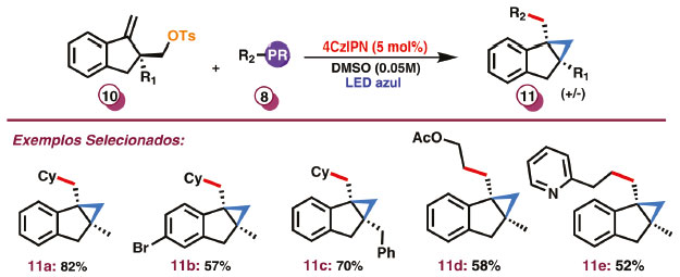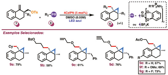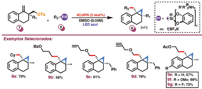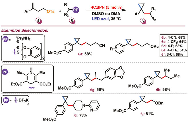 A fim de melhor entender como os efeitos eletrônicos nos tosilatos empregados interferiam no mecanismo reacional, um estudo de competição foi realizado. O estudo consistia em empregar diferentes análogos do tosilato 4, contendo grupos σ- ou π-retiradores de elétrons na posição para no anel aromático, na condição reacional otimizada. Após análise de alíquotas dessas reações por UPLC, foi observado que os tosilatos mais deficientes de elétrons apresentaram melhores conversões para formação do produto de interesse nos primeiros minutos da reação, indicando que tosilatos deficientes de elétrons podem facilitar a adição de Giese nos momentos iniciais da reação e/ou estabilizam o intermediário aniônico IV. Nesse trabalho, empregando as diferentes fontes de radical, tais como alquiltrifluorboratos de potássio e 4-alquildihidropiridinas, foram obtidos 30 ciclopropanos contendo diferentes grupos funcionais, como aminas e substituintes alquílicos, e com rendimentos de 43% a 97%. Ainda nesse contexto, Molander e colaboradores29 desenvolveram uma nova alternativa para obtenção de ciclopropanos policíclicos, de forma a usá-los como precursores de radicais bench-stable na catálise fotoredox (Esquemas 4 e 5).